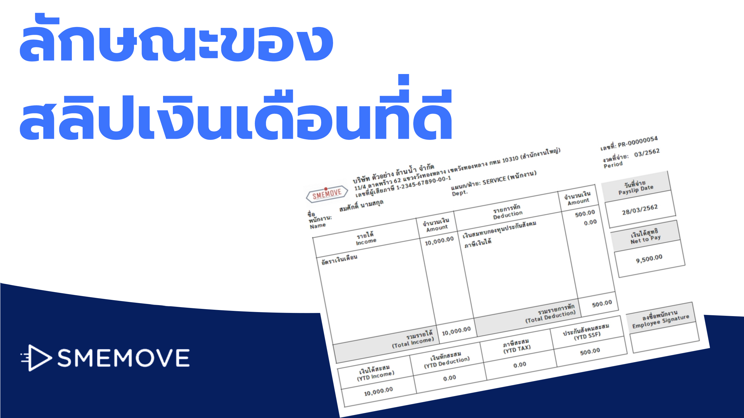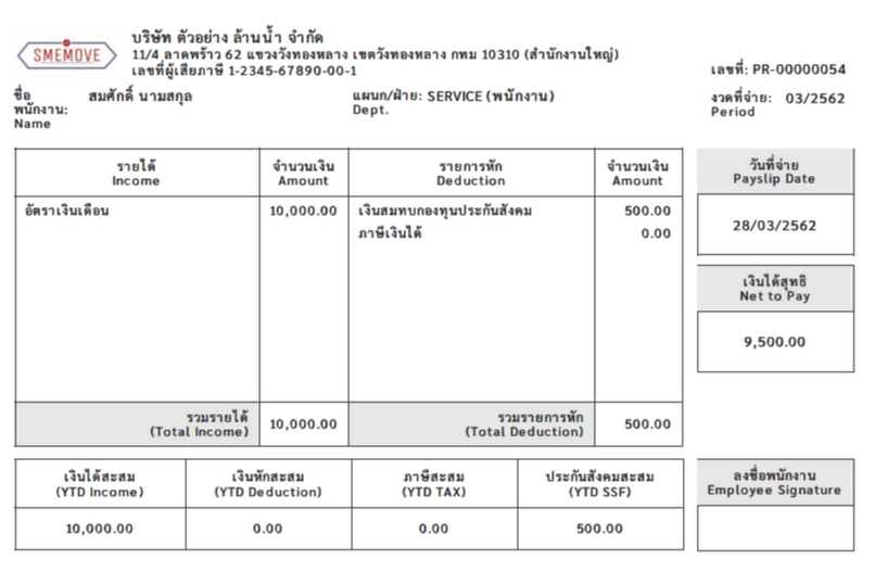นี่คือเอกสารตัวอย่างที่พรินต์จากโปรแกรม SMEMOVE ที่เป็นโปรแกรมบัญชีระบบ Cloud ที่ทำงานได้ทุกที่ทุกเวลา เพียงแค่มีสัญญาณอินเทอร์เน็ตและโปรแกรม SMEMOVE ตัวนี้ซึ่งจะคำนวณภาษีและประกันสังคมให้อัตโนมัติ สิ่งเหล่านี้จะทำให้การทำงานของคุณทั้งง่ายและสะดวกสบายมากขึ้นเลยทีเดียว สามารถดูวิธีการใช้งานต่าง ๆ ได้ที่ Youtube : SMEMOVE