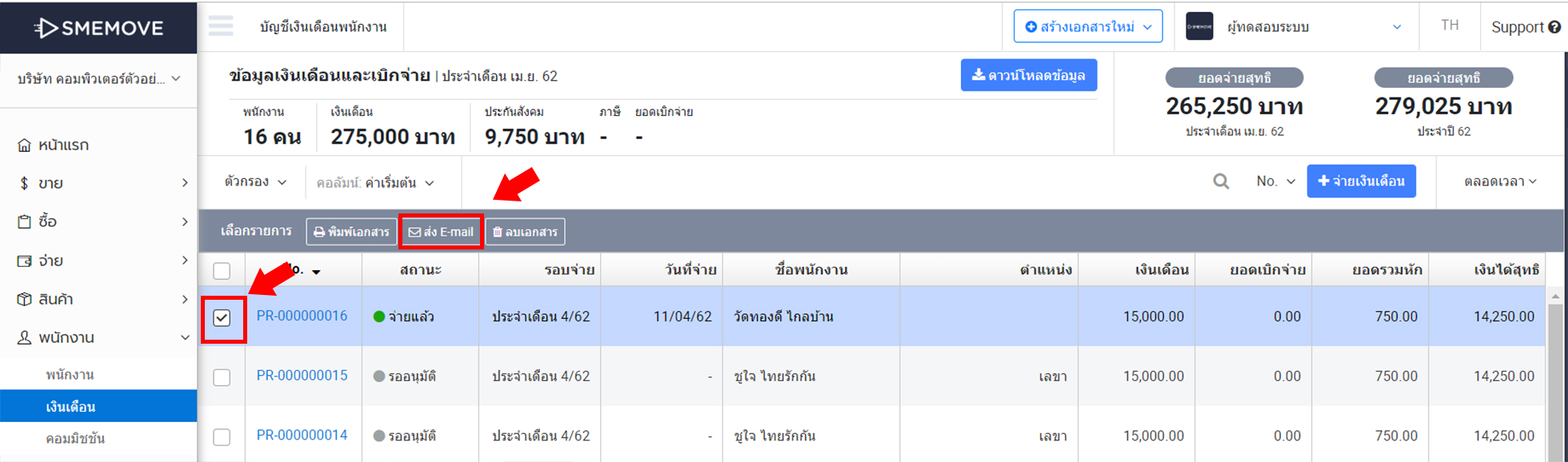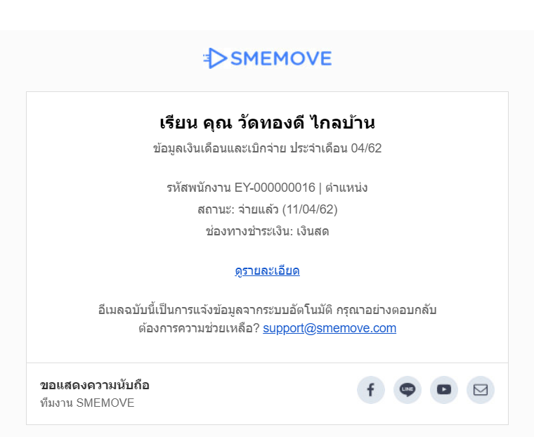 ตอนนี้โปรแกรม SMEMOVE สามารถส่งสลิปเงินเดือนทาง E-mail ให้พนักงานได้แล้ว ทำให้ลูกค้าประยุกต์ใช้งานตามความสะดวกของลูกค้าได้เลย