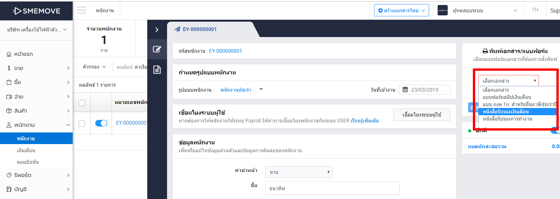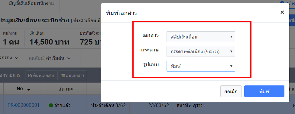 2. พรินต์หนังสือรับรองเงินเดือนพนักงาน