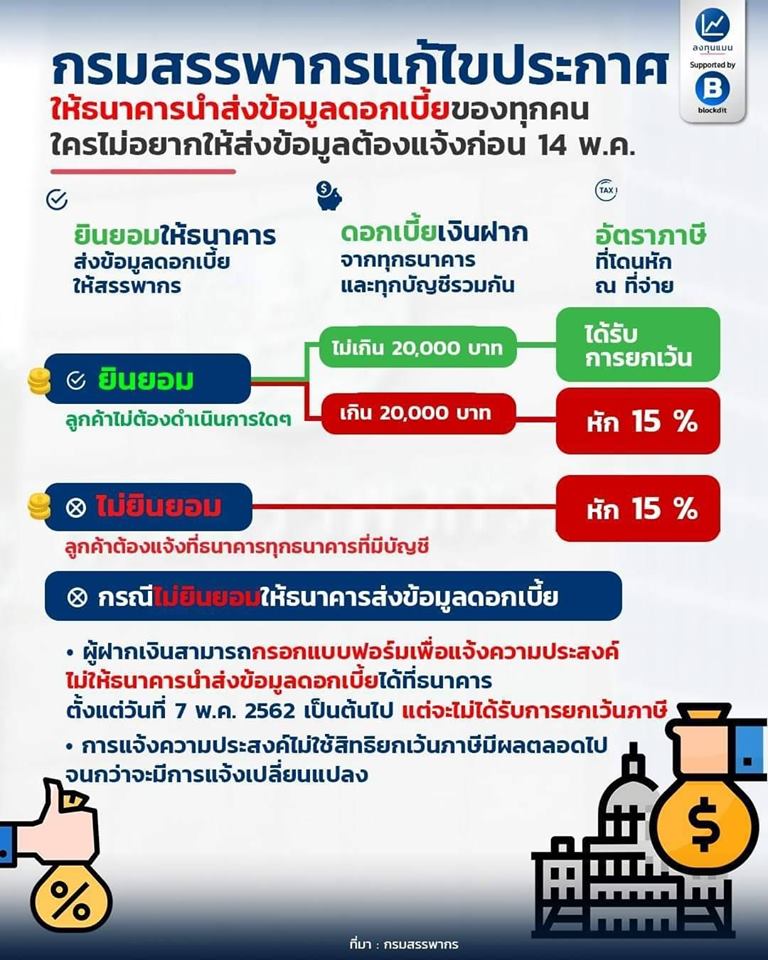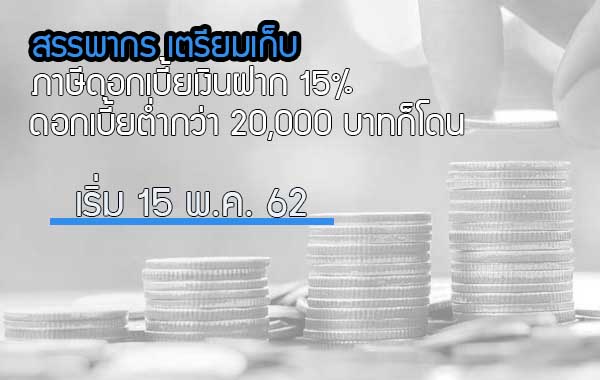 • สรรพากรจึงเตรียมที่จะเรียกเก็บภาษีดอกเบี้ยเงินฝากแม้ว่าดอกเบี้ยเงินฝากนั้นจะไม่ถึง 20,000 บาทก็ตาม