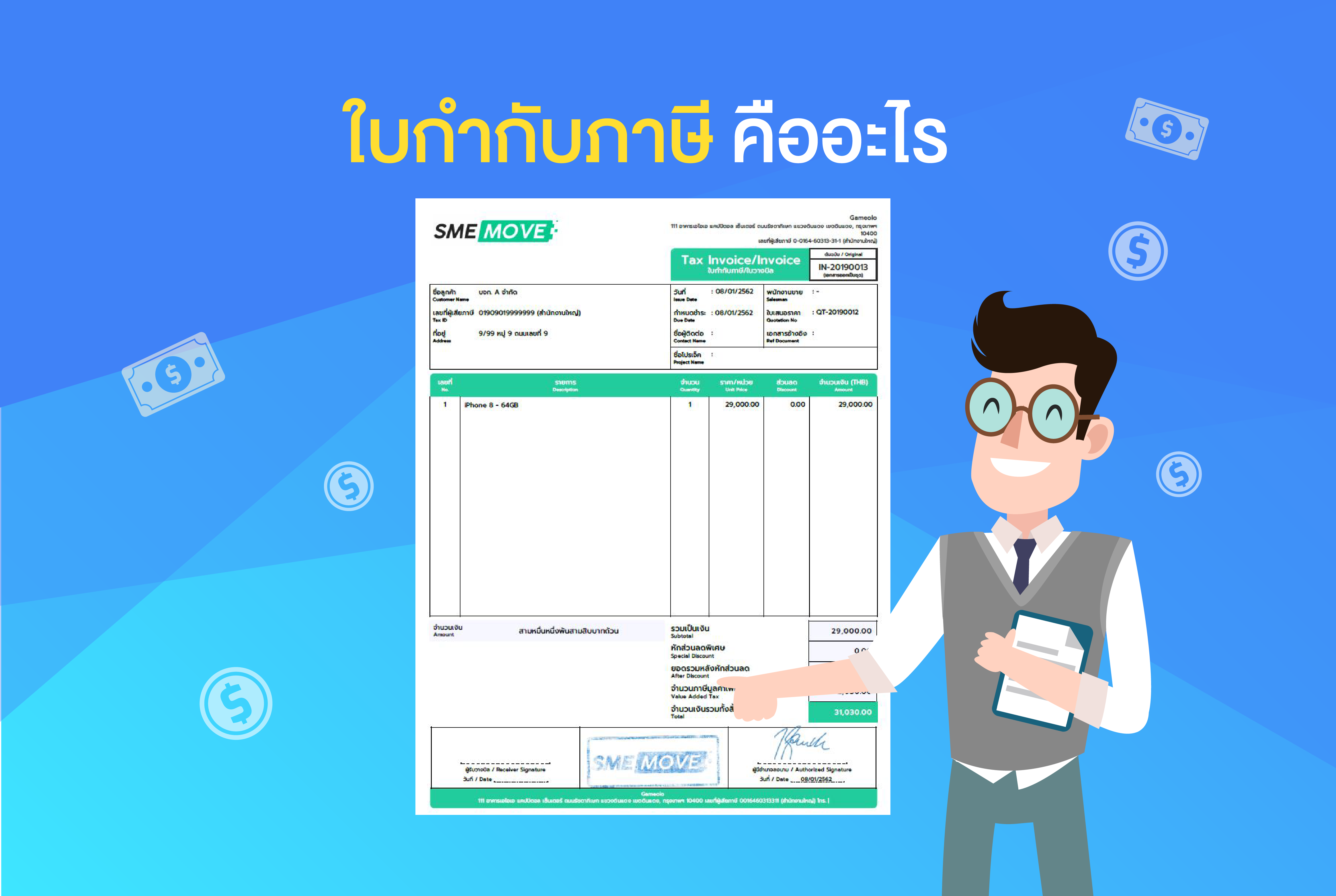 เป็นอย่างไรกันบ้างหลังจากที่ได้อ่านเรื่องใบกำกับภาษีกันไปแล้ว เราหวังว่าทุกคนคงจะเข้าใจเรื่องราวเกี่ยวกับใบกำกับภาษีมากยิ่งขึ้น หากใครที่มองว่าการทำใบกำกับภาษีดูยุ่งยาก ให้ลองใช้โปรแกรมบันทึกบัญชีออนไลน์ของ SMEMOVE แล้วคุณจะรู้ว่าการออกเอกสารทางการบัญชีไม่ใช่เรื่องยากอีกต่อไป