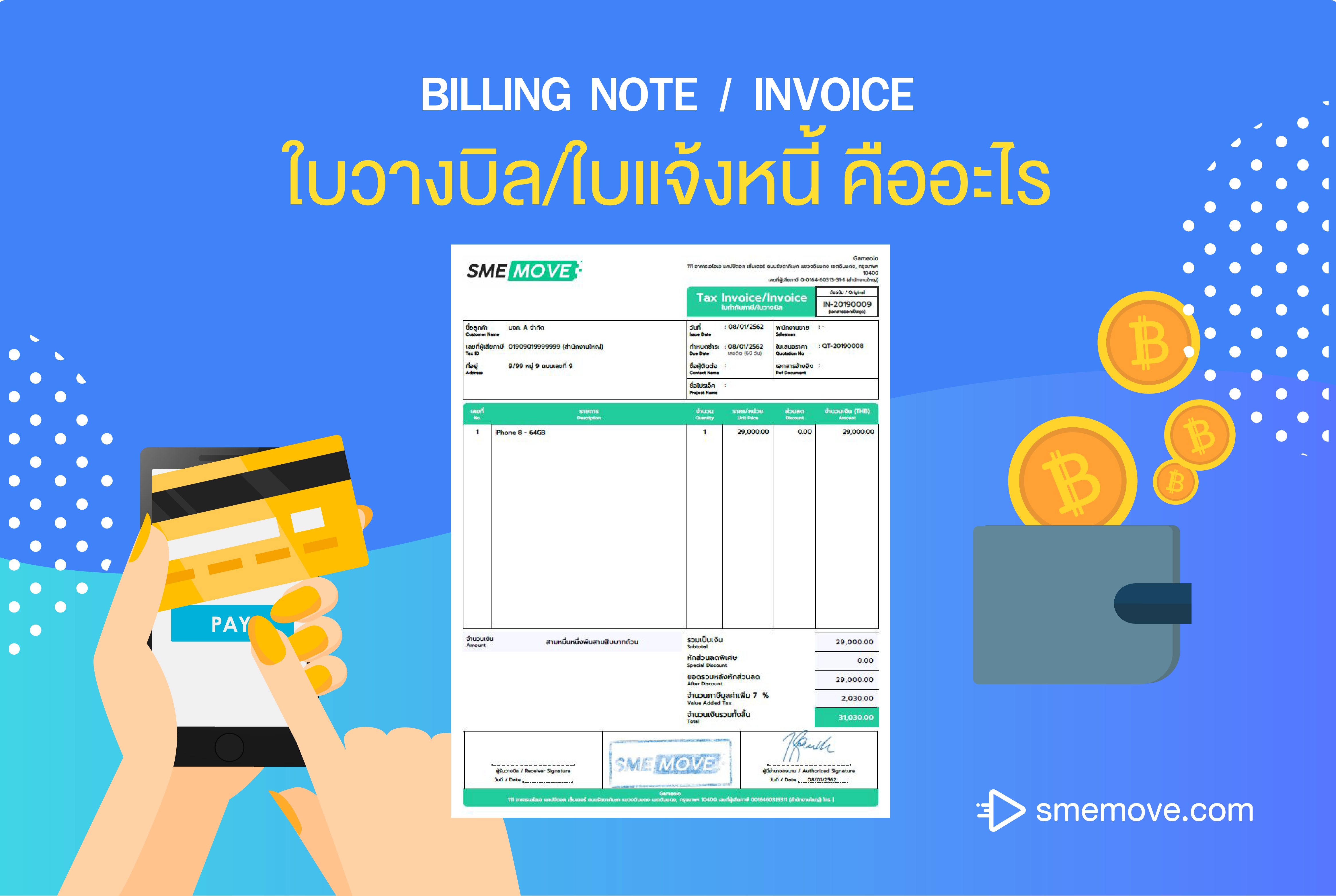 SMEMOVE เป็นหนึ่งในโปรแกรมบันทึกบัญชีออนไลน์ที่สามารถจัดทำเอกสารใบวางบิล และใบแจ้งหนี้ได้ โดยที่คุณไม่ต้องเสียเวลาในการจัดทำแบบฟอร์ม เพียงแค่กรอกข้อมูลสำคัญลงไป โปรแกรมบันทึกบัญชีออนไลน์ SMEMOVE ก็จะทำการจัดทำเอกสารสำคัญของคุณได้ในอัตโนมัติ พร้อมพิมพ์ออกมาใช้งานได้ทันที หรือจะส่งเป็นไฟล์ผ่าน Email ก็สามารถทำได้ง่ายๆ สนใจสามารถทดลองใช้งานฟรีได้ที่ WWW.SMEMOVE.COM
